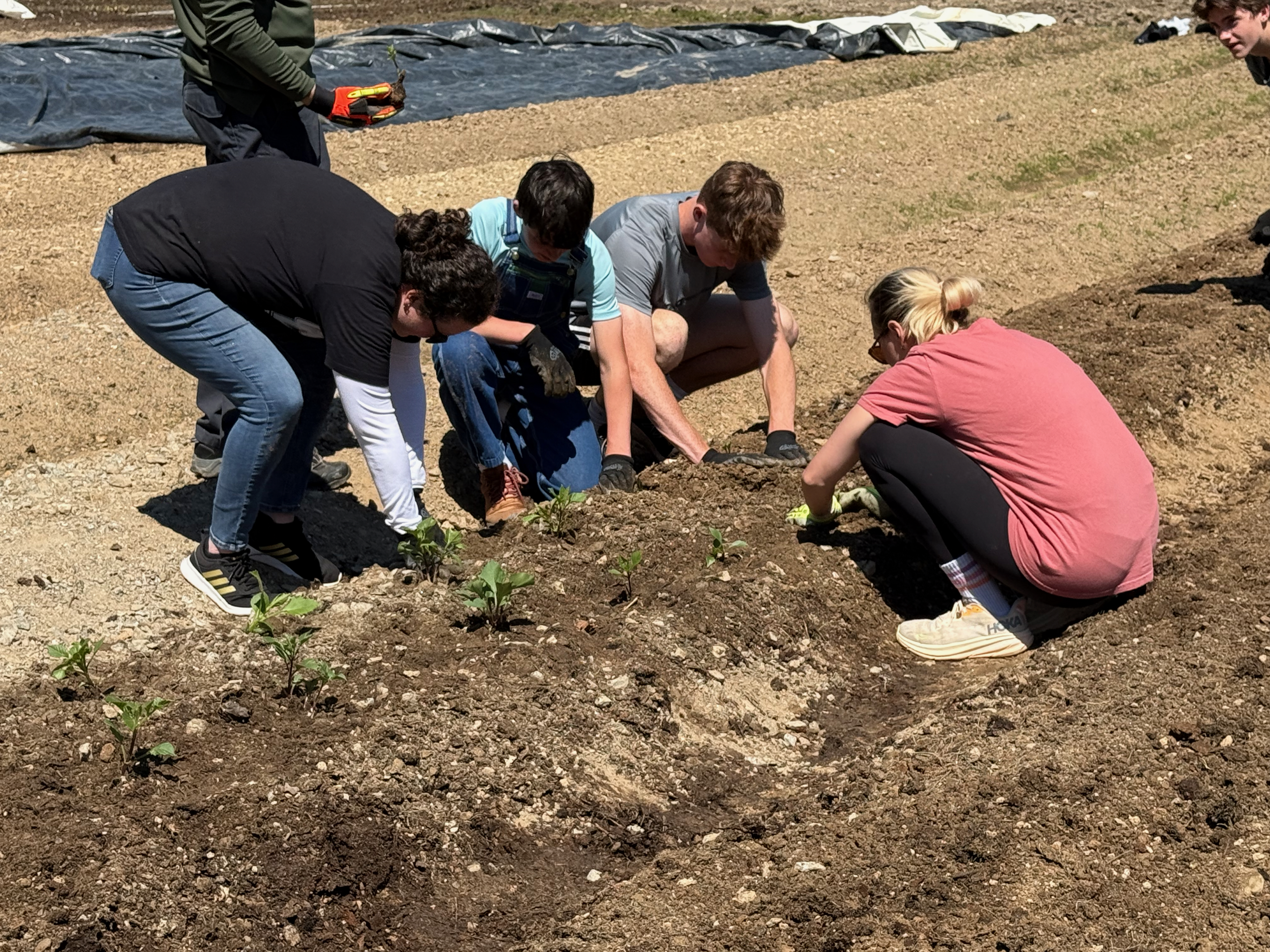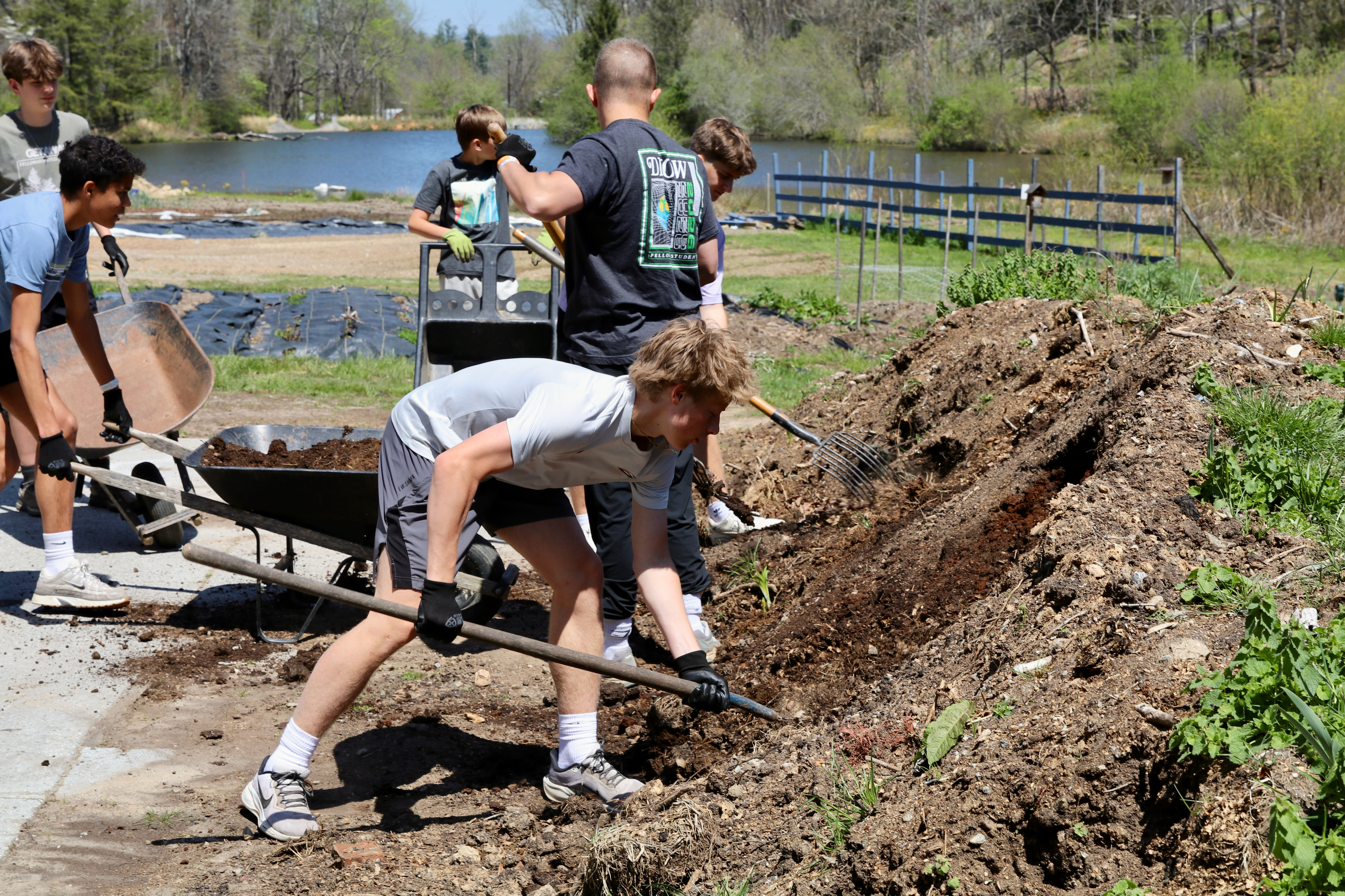 In the afternoon, both teams came together at Veterans Healing Farm, a nonprofit that serves veterans through agritherapy. Students shoveled compost, planted dahlias, mulched, and tackled a variety of projects to help prepare the farm for the upcoming season.